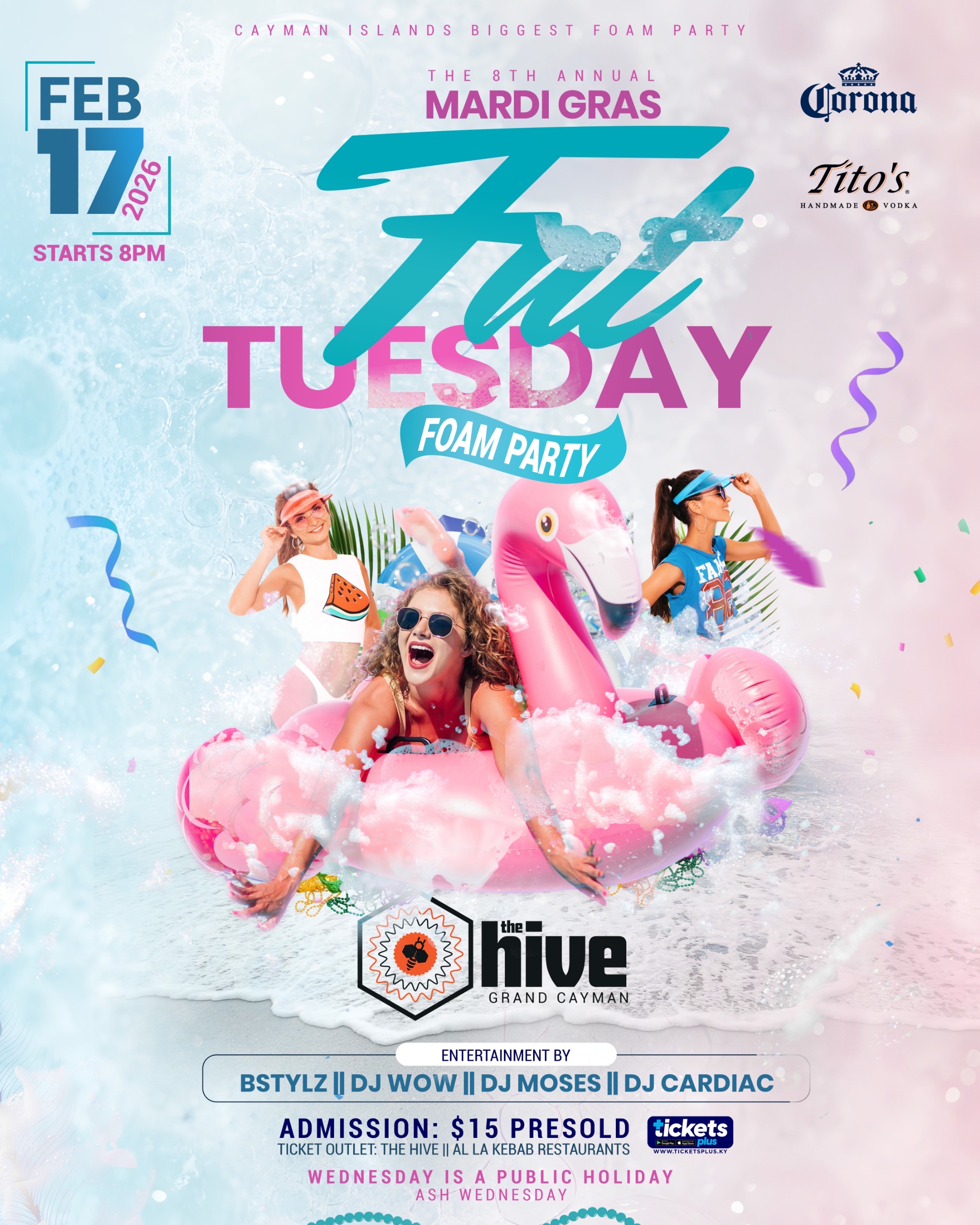 The 8th Annual Mardi Gras Fat Tuesday with The Biggest FOAM Party. Tuesday February 17th, 2026